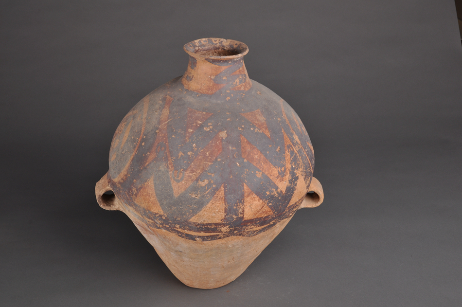 新石器时代马家窑文化马厂类型蛙纹双耳罐,口径9.4cm,高42.3cm,重5005.0g,泥质黄陶,罩红色陶衣。侈口,斜直径,丰肩,弧腹下斜收,平底。肩腹连接处有对称双耳。器外壁肩腹部主体纹饰为蛙纹。