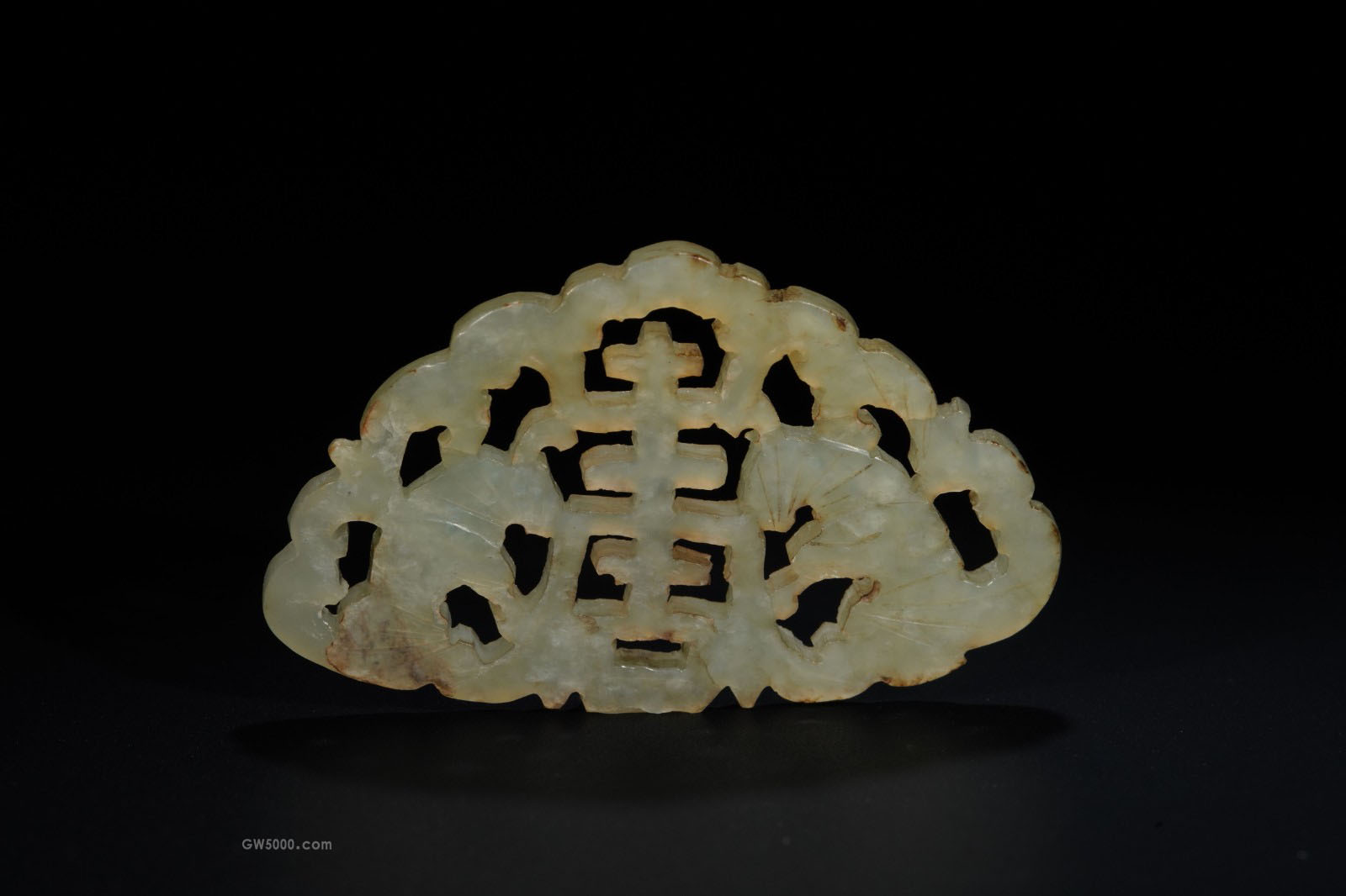 白玉质,呈扁平三角形,镂空雕,中间为一寿字,旁有两瑞兽围绕。