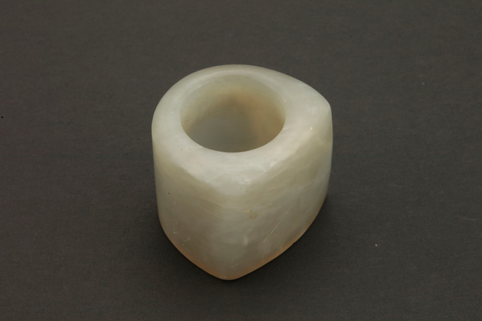 扳指原为射箭时戴于指上引弓拉弦之用,后代逐渐演化为装饰之物。清代满族以骑射夺得天下,对扳指颇为珍爱,故清代扳指制作精美,选料多样。此扳指白玉为之,圆柱形身上有一块打磨平整,色微黄。质温润。