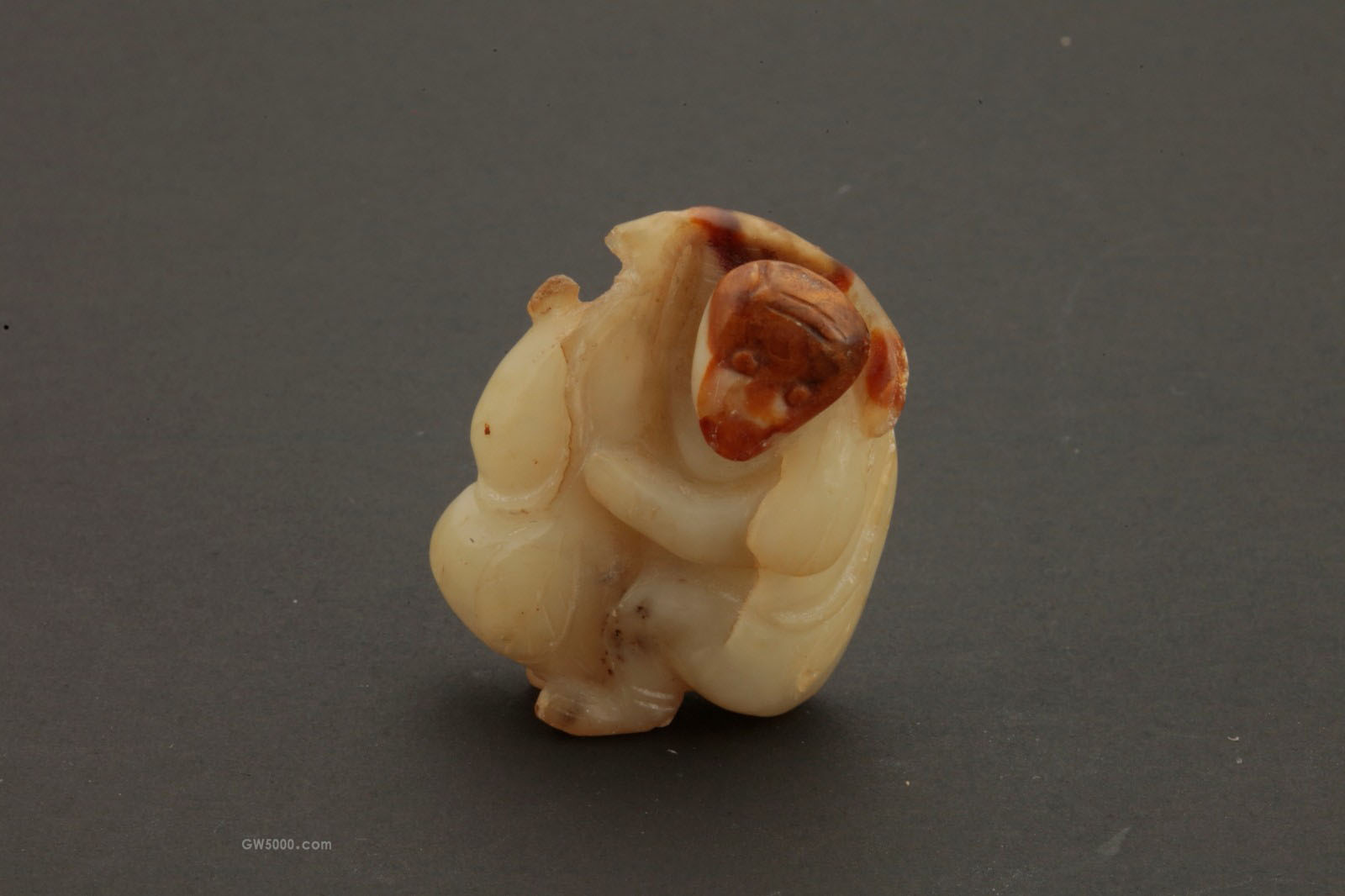 白玉质,色泽偏黄,质地较软;圆雕一猴子手捧寿桃,桃茎处有断裂;以玉皮处巧雕猴脸,皮色枣红,精巧至极;以大刀深刻技法雕出猴身及四肢,并以短小阴刻线展示细部,刀法粗狂,可做佩戴把玩之用。 “猴”与“侯”谐音,寓意功成封侯,猴捧寿桃,更有福寿绵长之意。