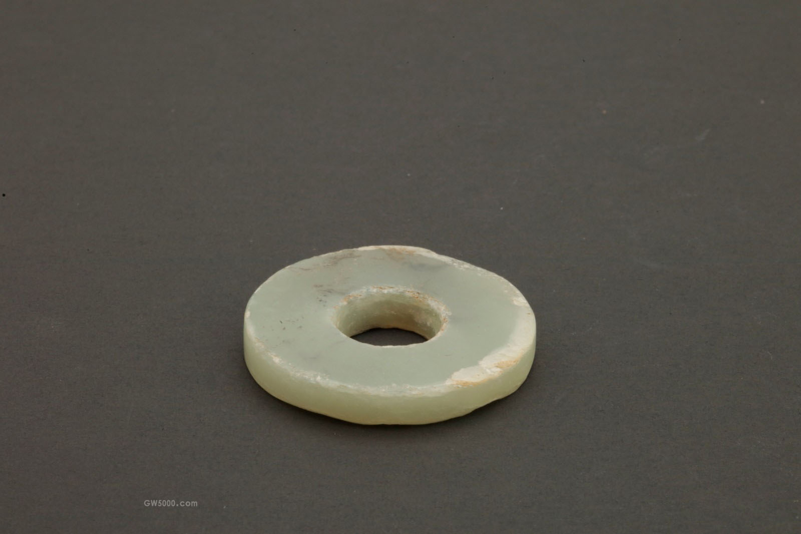 青玉,色泽偏黄,质地较软,光泽度较差,内部有黑沁,边缘磨损;玉作环壁状,未施加任何雕工,从磨损程度看,应为实用器。