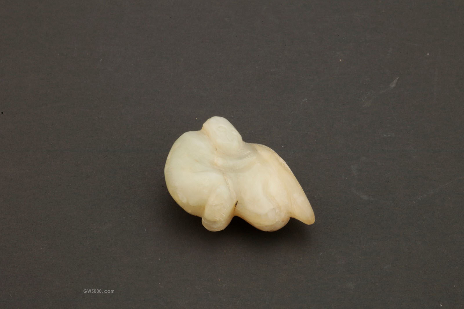 玉质,玉猴做半蹲立状,侧首直视,双臂环抱着一个硕大的桃子,叶脉清晰可见。猴子献桃是明清玉雕中常见的题材,由于仙桃寓意长寿,因此猴子献桃也不脱吉祥的传统风尚。