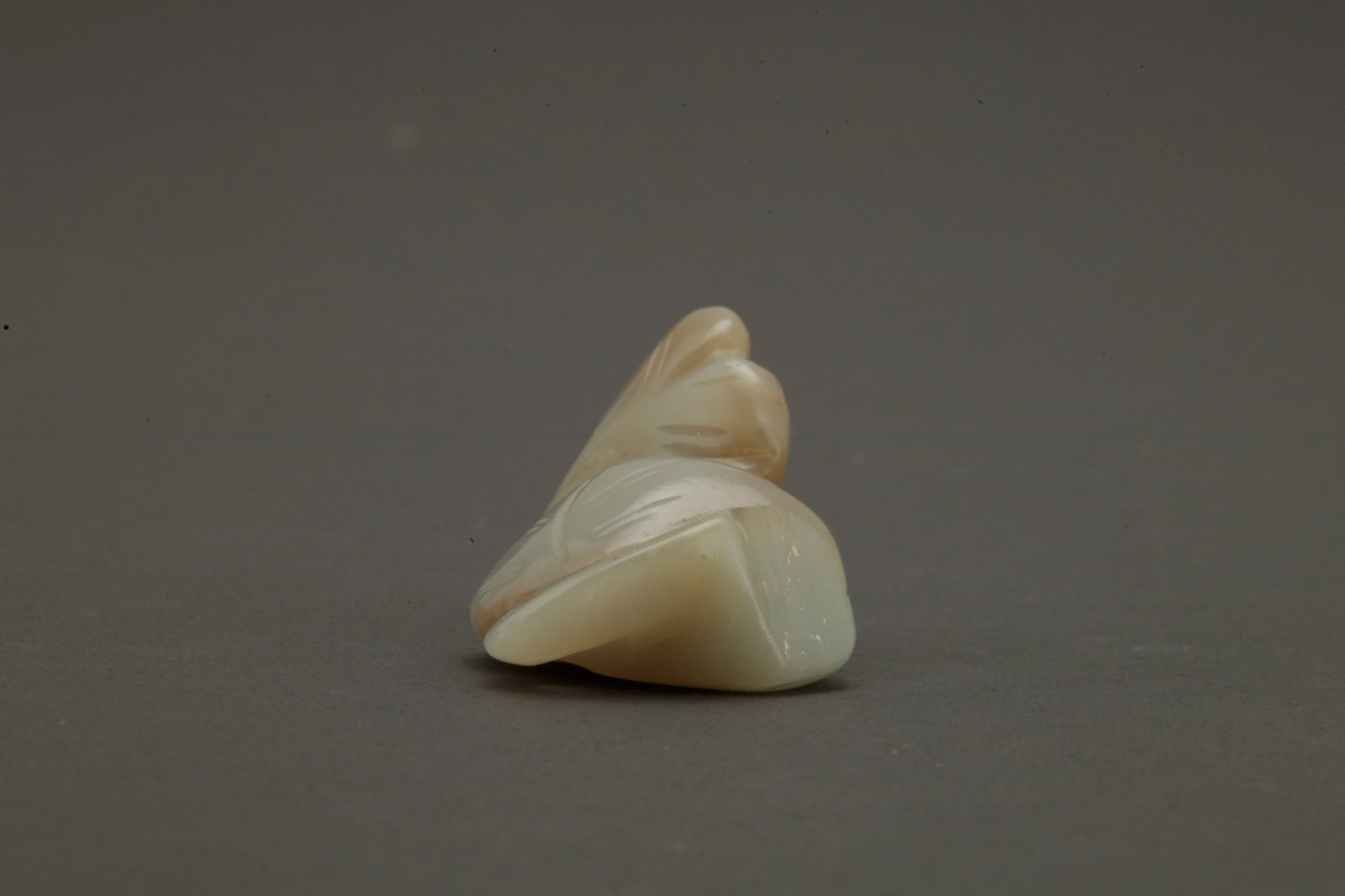 玉质挂件,全器顺著玉料本身形状雕琢成一身驱肥短之鱼形,鱼头雕一桥形钮,中间穿孔,尾鳍向上翘起,鱼肚下方莲叶纹隐约可见,因“莲”音同“连”,取其“连年有余”之吉祥意涵。玉质莹润,背面多处沁色。