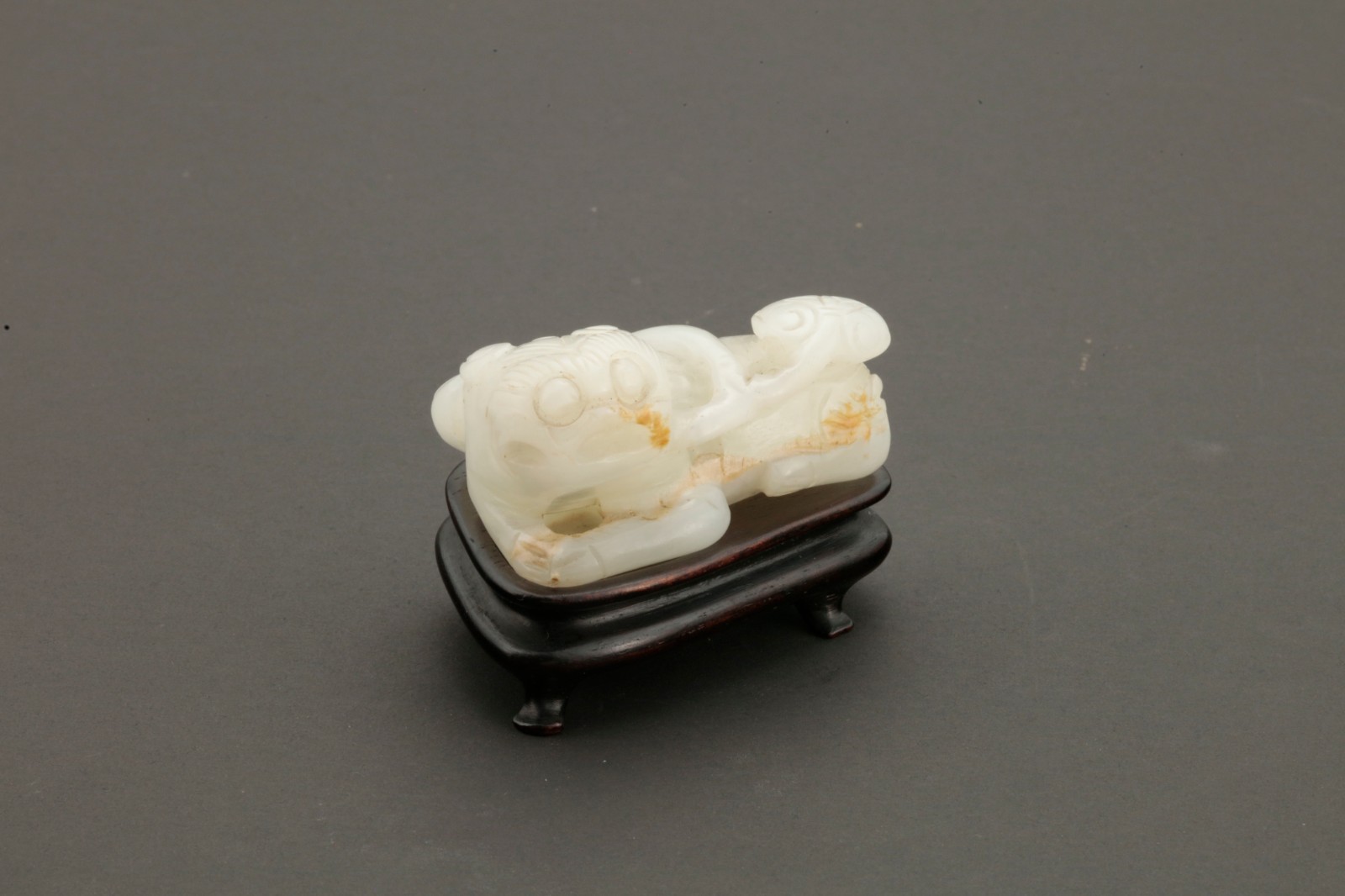 白玉质,雕刻一静卧状的狮子,立眉圆目,远眺前方,嘴巴开咧,尾巴卷起。玉质温润,雕刻线条流畅,包浆厚实,玉上有几处皮壳俏色为饰,更显奇巧。此类玉雕小巧,即可把玩,也可置于书案增添雅趣。配一木质器座。