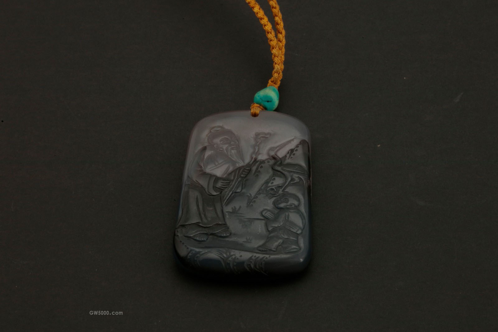 挂牌正面主体浮雕携琴访友的画面,左边巧雕俏色手执龙头拐的长衫老者,右下雕一携琴童子,背景绘远山和仙鹤,底部边缘刻花草配衬。背面巧雕俏色池塘、乌龟、鱼、水草等纹饰,整体布局紧凑,线条流畅,依形而做,整体观感舒适。挂牌上面有对穿孔,光泽油亮,细腻湿润。