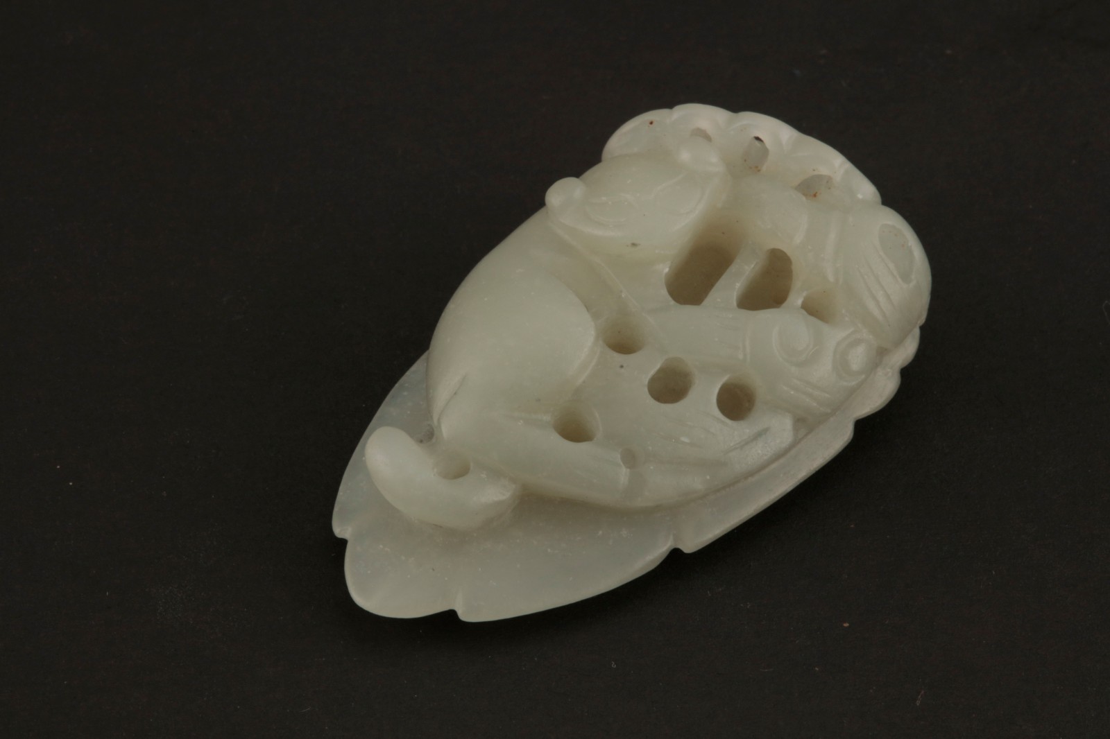 白玉,玉质温润,洁白细腻。正面雕一獾卧于叶子之上,背面阴刻线镌出叶子脉络。造型规整,雕工质朴。意为“欢新守业”,寓意吉祥,希冀后代继承家业,生生不息。