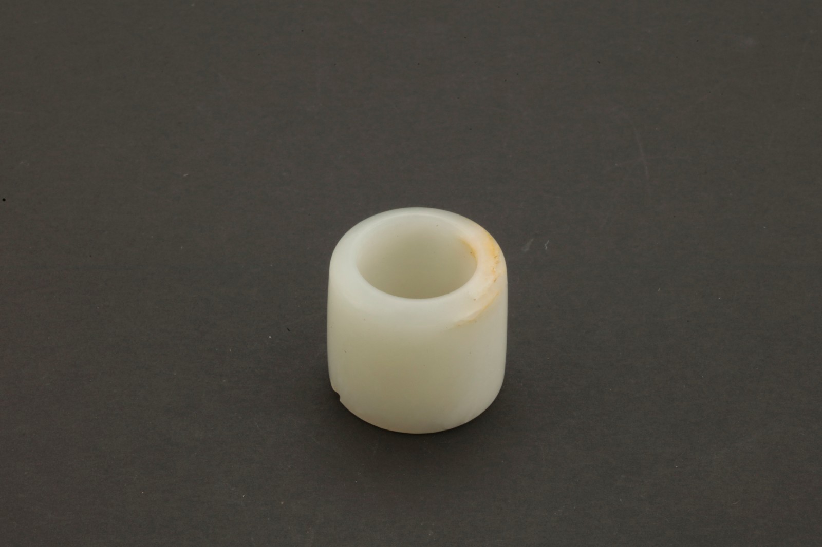 白玉,玉质温润,洁白细腻。圆筒状,中心镂空,造型规整。上端两处绺烈,带黄色沁。玉扳指,又叫玉韘,是拉弓射箭时扣弦用的一种工具,套在射手右手拇指上,以保护射手右拇指不被弓弦勒伤的专用器物。