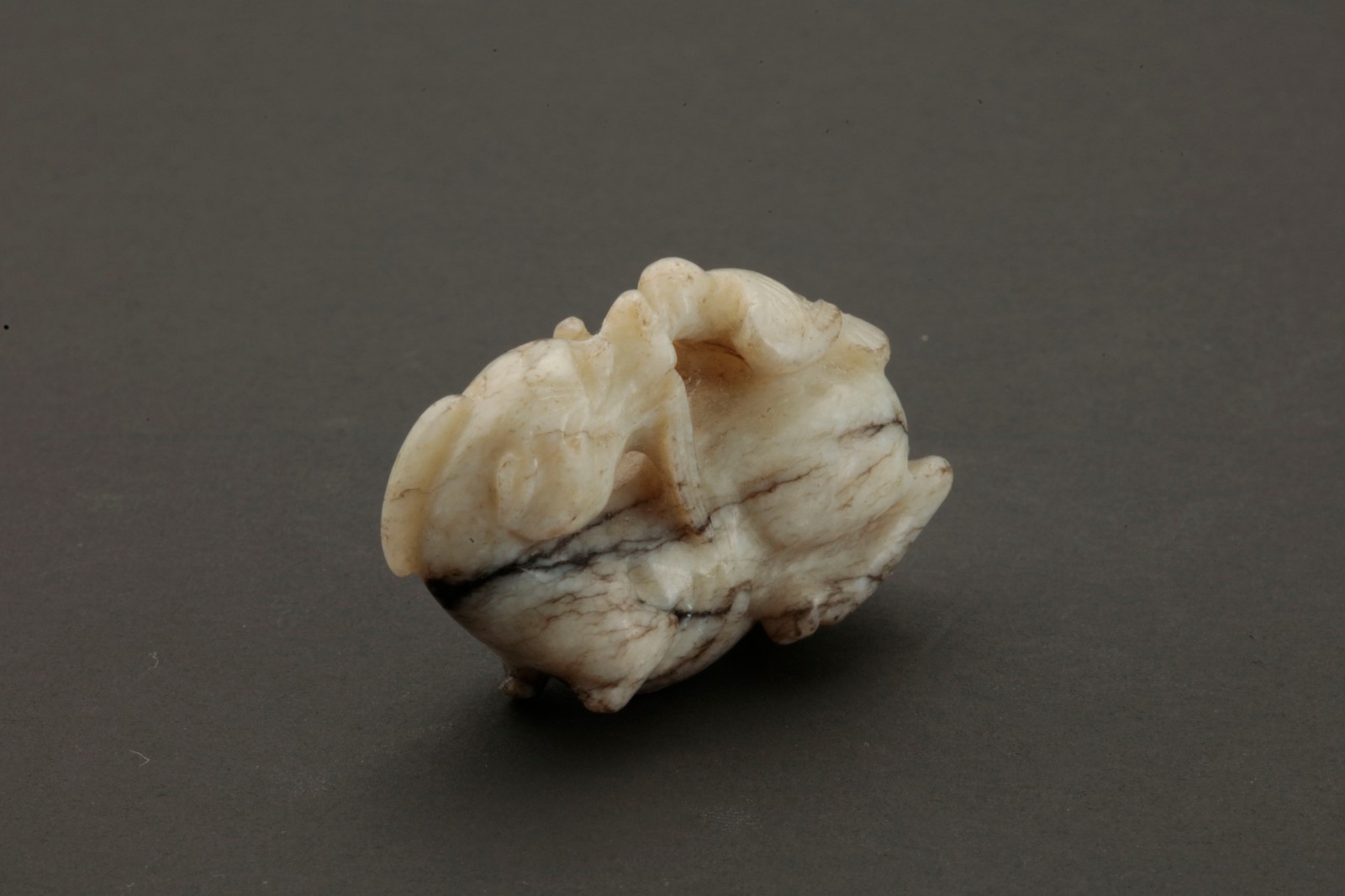 青白玉,玉色偏黄,绺裂处现褐色沁。用圆雕结合镂空工艺,雕刻鹰戏兽图案,一鹰站立于走兽背部,鹰嘴正啄走兽颈部,造型生动,富有童趣。