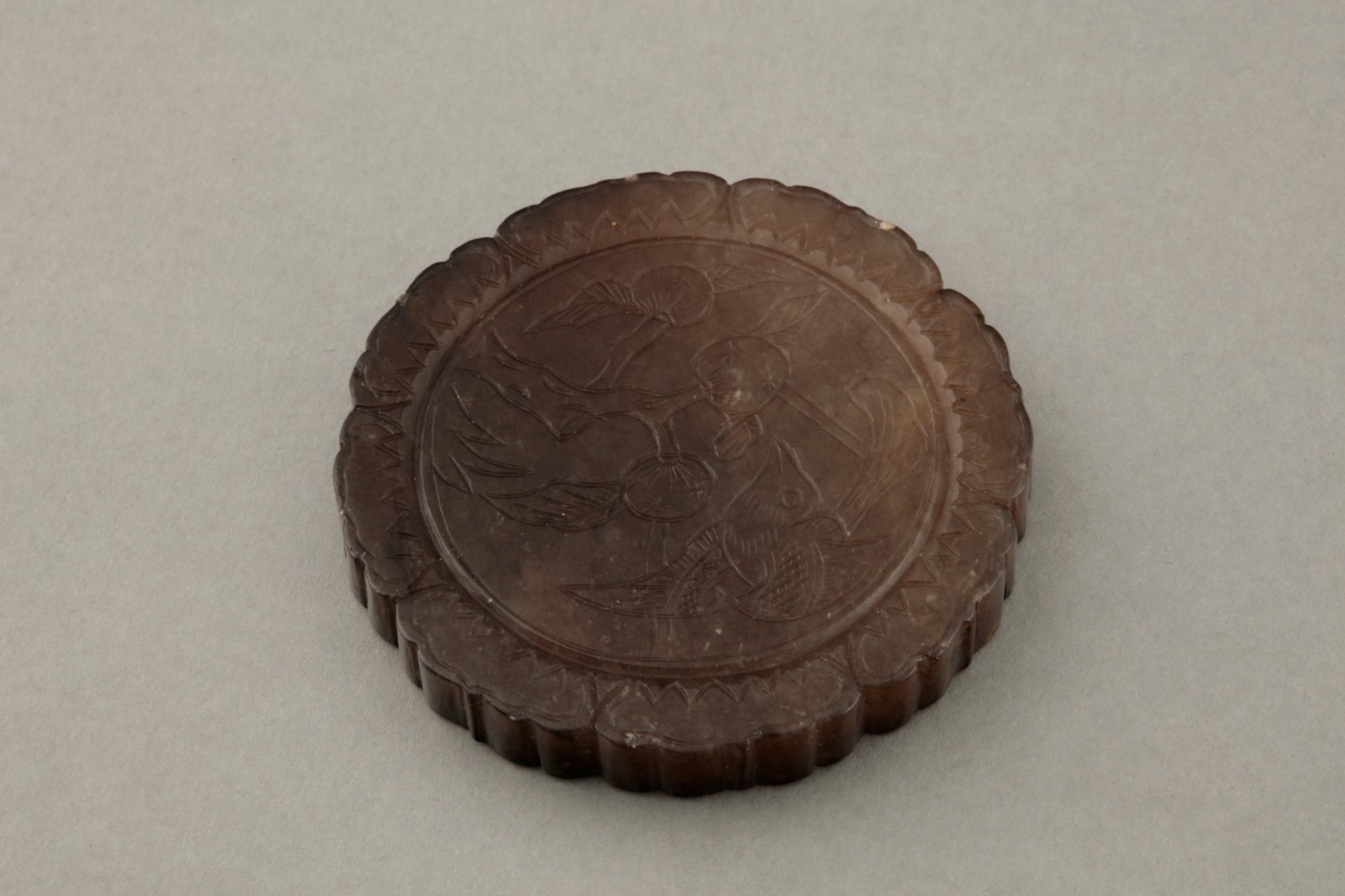 玉色偏黄褐色,玉质略粗。整体为圆形,边缘为花瓣形,正面中心为花鸟纹图案,鸟似为山雀,正张口欲食果实,动态十足,栩栩如生。背面有两对穿蚁鼻孔,用于穿绳佩戴。