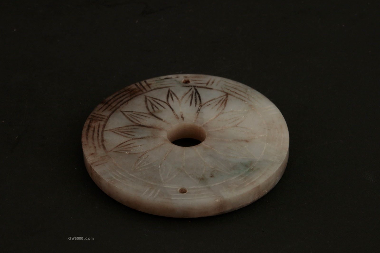 翡翠玉,整体白色为主,间带翠色。通体圆形,片雕,中间圆孔,两次边缘各穿一小孔,正面雕刻桃纹,背面阴刻花卉纹,造型简洁,纹饰生动。