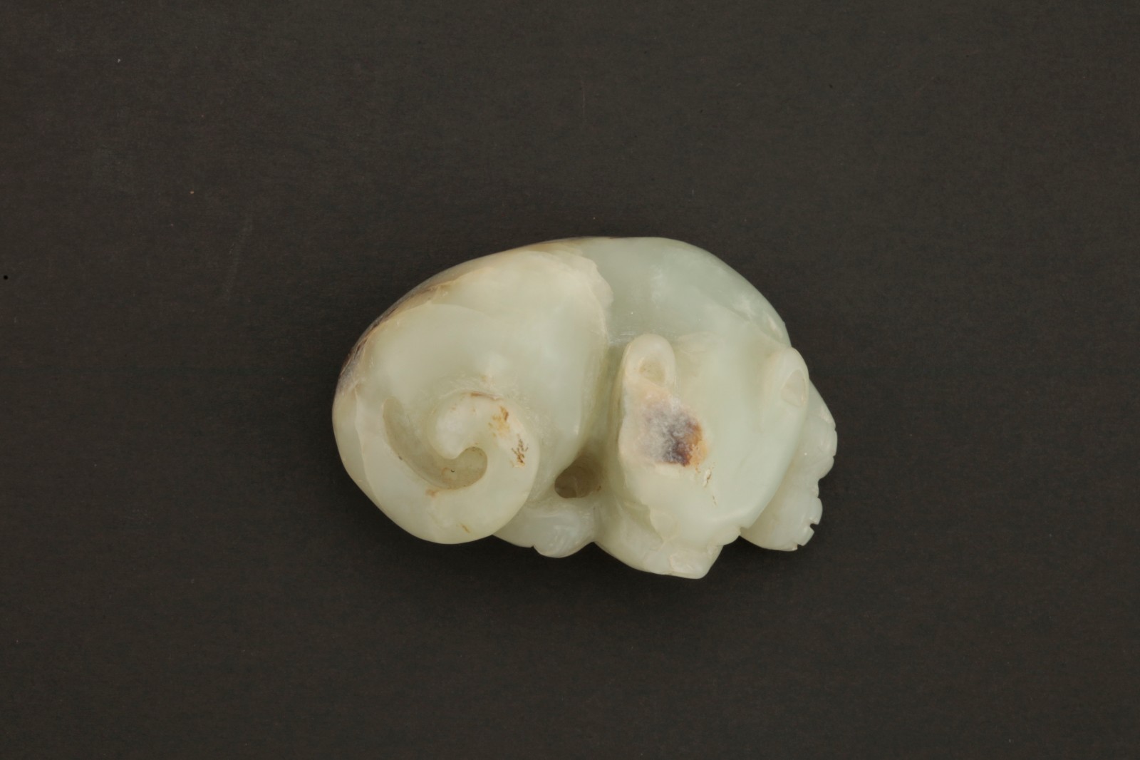 和田青玉,玉质较为温润,用圆雕结合镂空工艺,整体为卧狮形,身体蜷曲,四足收紧,头部卧于前肢之上,尾部弯曲,多处绺烈,带褐色沁,狮子憨态可掬,童趣盎然。