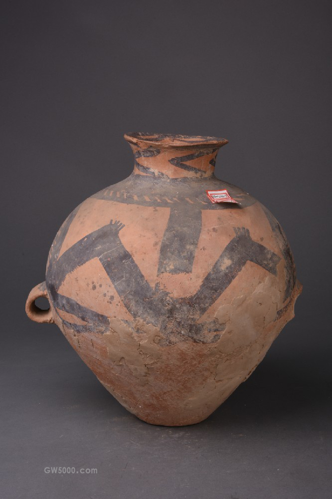 马家窑文化马厂类型蛙纹双耳彩陶罐,口径11,高31,重3070,泥质红陶,侈口、束颈、丰肩、弧腹斜收、平底。腹部有对称环形双耳,施黑彩,口沿内饰连弧纹,颈肩部位波折纹,腹部绘两个对称圆圈波折纹、蛙纹,下侧饰连弧纹。