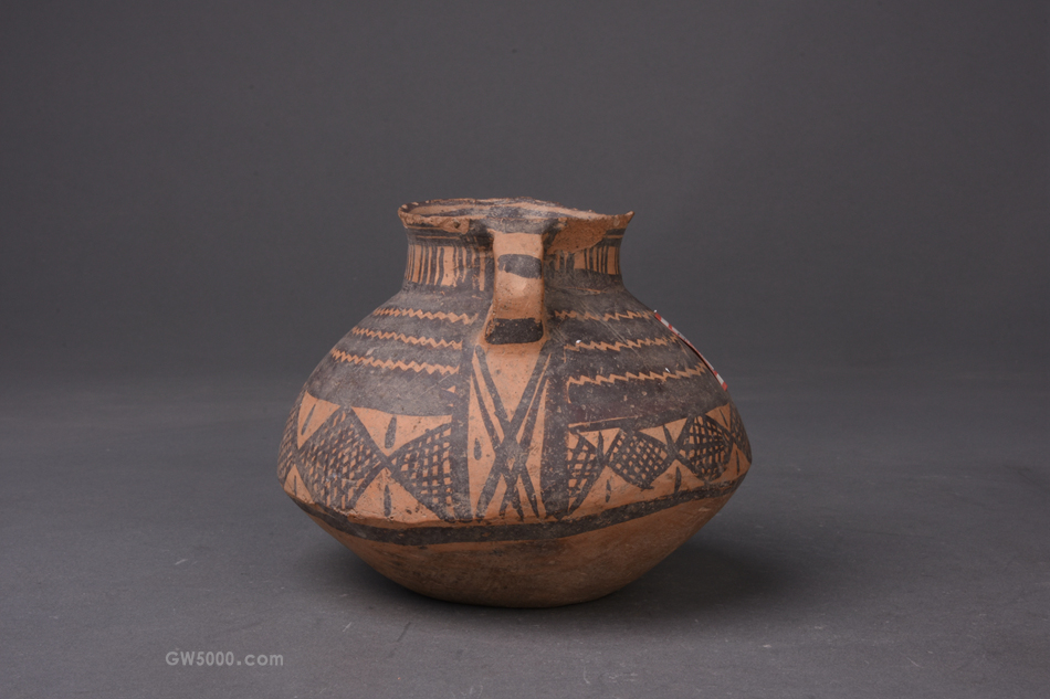 马家窑文化马厂类型双耳彩陶罐,口径7,高12,重400,泥质红陶,侈口、直领、折腹、平底,肩部有对称双耳。通体罩红陶衣,施黑彩。口沿内外侧及耳部各饰三道平行条纹,肩部饰宽带锯齿纹;腹部饰菱形网格纹、宽带纹、折线纹。