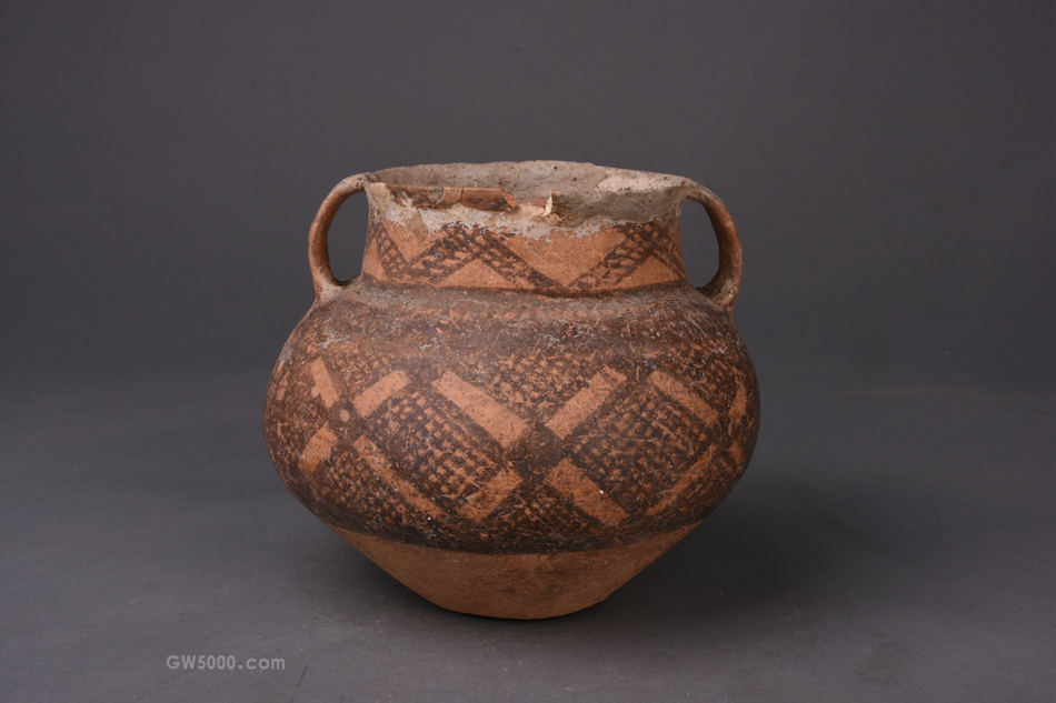 马家窑文化半山类型双耳彩陶罐,口径13.5,高17.2,重800,泥质红陶。尖唇侈口,直领,鼓腹内收,小平底。口沿下有对称双耳,饰黑彩,颈部饰网格纹,腹部饰三角纹、平行线纹、网格纹。整体造型规整,纹饰繁缛。