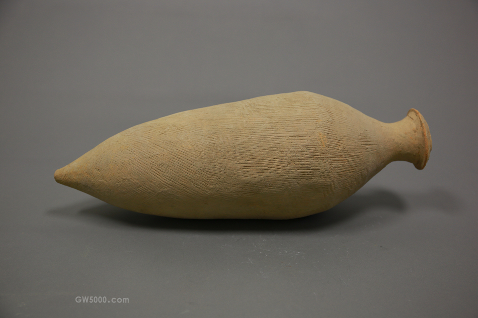 新石器时代仰韶中期(庙底沟类型)尖底瓶,口径8.2,高45,重1645克。泥质红陶,双唇口,长束颈,溜肩,斜直腹下收,尖底。器外壁满饰绳纹。