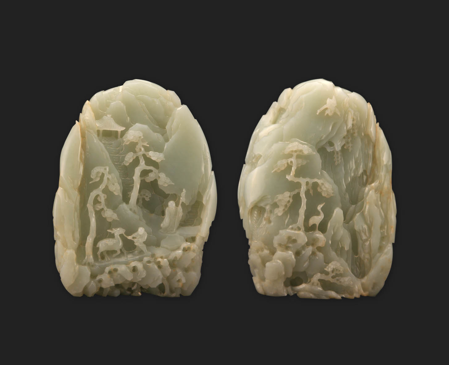 立体山形,双面浮雕。正面高浮雕高山、峻岭、劲松、孤亭;盘山小道上一寿星驻足回身招呼牵鹿童子跟上,鹿似因山道险峻而裹足不前,童子正转身吃力的牵引。背面浮雕一鹤傲立劲松之下,一鹤盘旋云间,悬崖峭壁,沟壑纵横间激流飞湍。此件玉山子体积较大,青白玉玉质纯洁,上雕山石、松树、祥鹿、仙鹤和寿星,寓意福寿延年,松鹤长春。山石边沿,人物衣褶,树木轮廓均雕琢细腻,景物远近有致,雕工精美绝伦。(林元平)