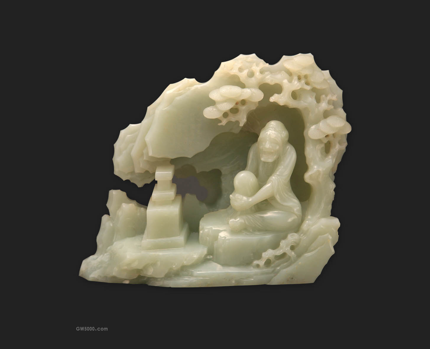 山子正面为高透雕松石下一盘腿抱漆而坐的罗汉,罗汉的两道寿眉长垂及肩,作开口哈欠状。边上立体圆雕一塔,石上阴刻佛本生故事诗文一首。另一面浮雕阶梯山石及二桂树。长眉罗汉居十八罗汉中的第十五位,真名阿氏多,得佛陀度化后,在佛陀的身边,勤修苦学,不久就修成了阿罗汉果,称长眉罗汉,也被称为长眉大仙。阿氏多是梵文无比端正的音译,寓意除妖降魔,驱邪镇恶。此件山子为青白玉,玉质温润,采用高浮雕和透雕工艺琢磨而成,造型大方,罗汉神态自然,衣褶飘逸,工料俱佳,是清中期玉山子中的佳品。(林元平)