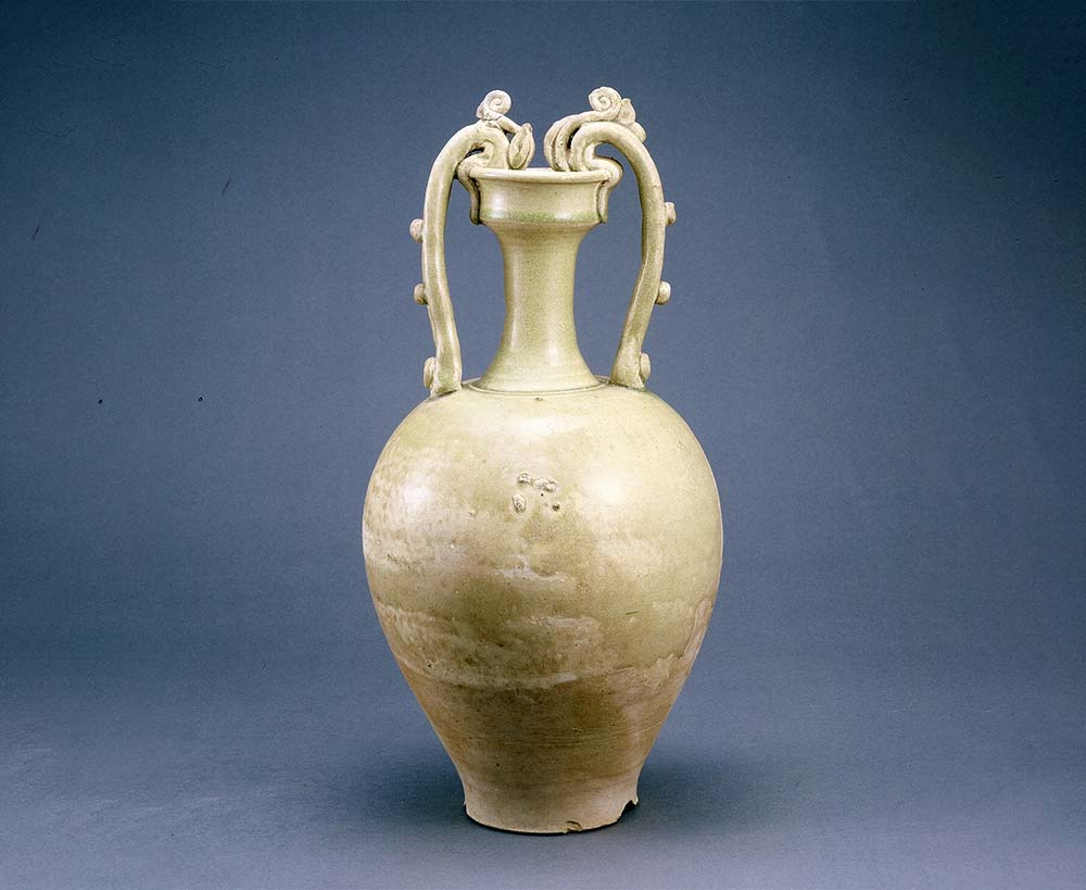 卷沿,盘口,细长颈,丰肩鼓腹,平底。双龙耳高耸于口沿,垂至肩部。颈和肩部划双弦纹。施釉不到底,釉稍泛青色。双龙耳瓶的器形是在鸡头壶的基础上吸收了外来胡瓶特点产生的,盛行于初唐时期。1959年陈嘉庚先生征集,现收藏于华侨博物院。