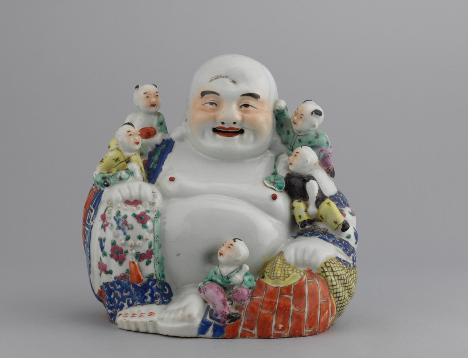佛像器型周正,弥勒佛体态圆润,彩袍加身,宽肩露胸坦腹,慈眉善目,笑容可掬,右手握珠,左手执布袋,赤脚席地而坐。五顽童形态各异,与之嬉戏,栩栩如生,十分的可爱。整器造型端庄稳重,雍容大度。施彩艳而不俗,胎釉俱佳。五子代表了宽容、和善、智慧、幽默、快乐的精神,弥勒佛又是未来佛,将五子登科与弥勒佛结合在一起,代表了人们对于未来的美好祝福。底无釉,落“江西景镇同义顺造”印章款。