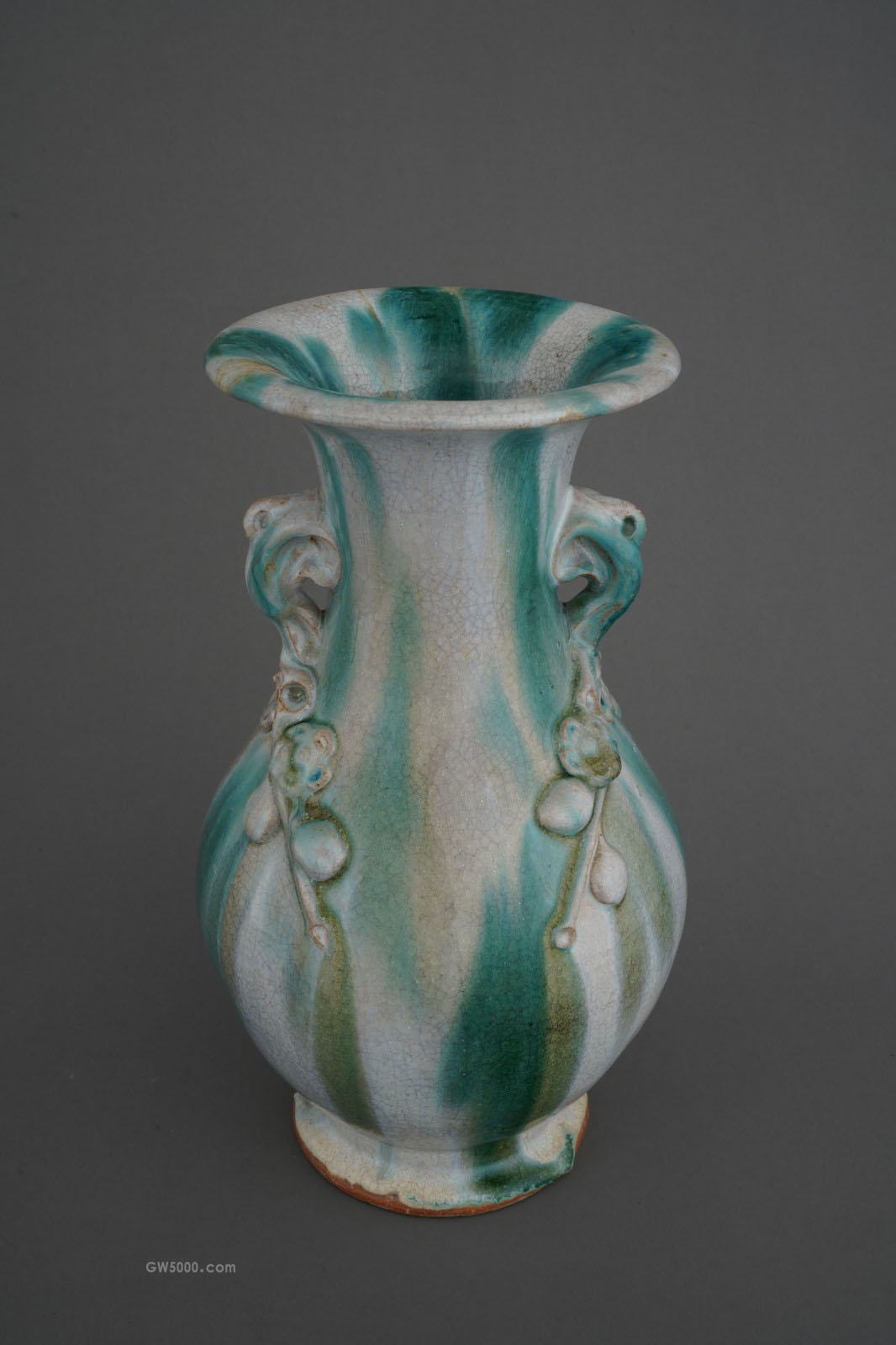 圆唇,口外撇呈嗽状,束颈,鼓腹,足外撇,圈足底无釉。通体白绿釉相间,线条流畅,密布细碎开片。颈部饰双铺首耳,采用浮雕技法,贴塑桃花延至腹部,契合中国古代“对称”的装饰规则,桃花形态饱满,使整体更加凹凸有致,充满立体感。