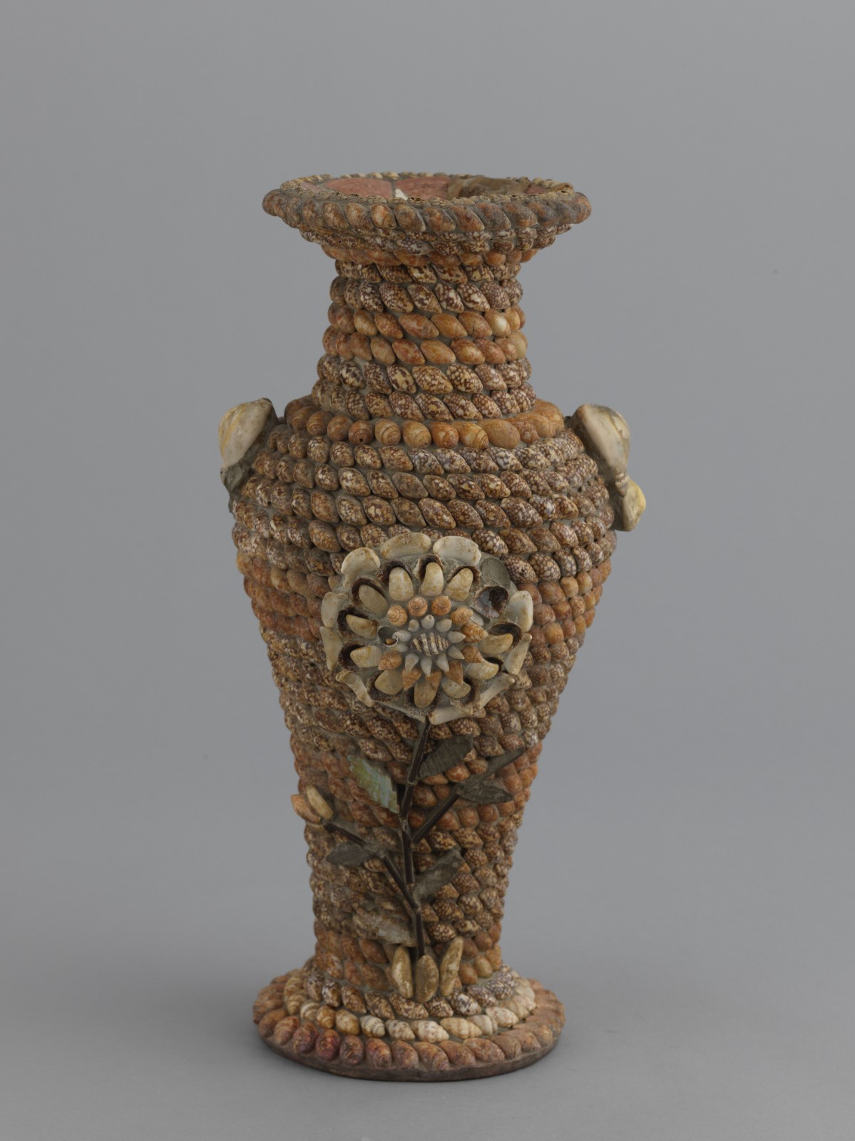 唇口,粗径,丰肩。腹部至足底渐收,底足外撇,通体镶嵌螺丝形小贝壳,肩部贴大贝壳为铺首,腹部中间贴塑一朵用各种贝壳组成的太阳花,水泥平底。