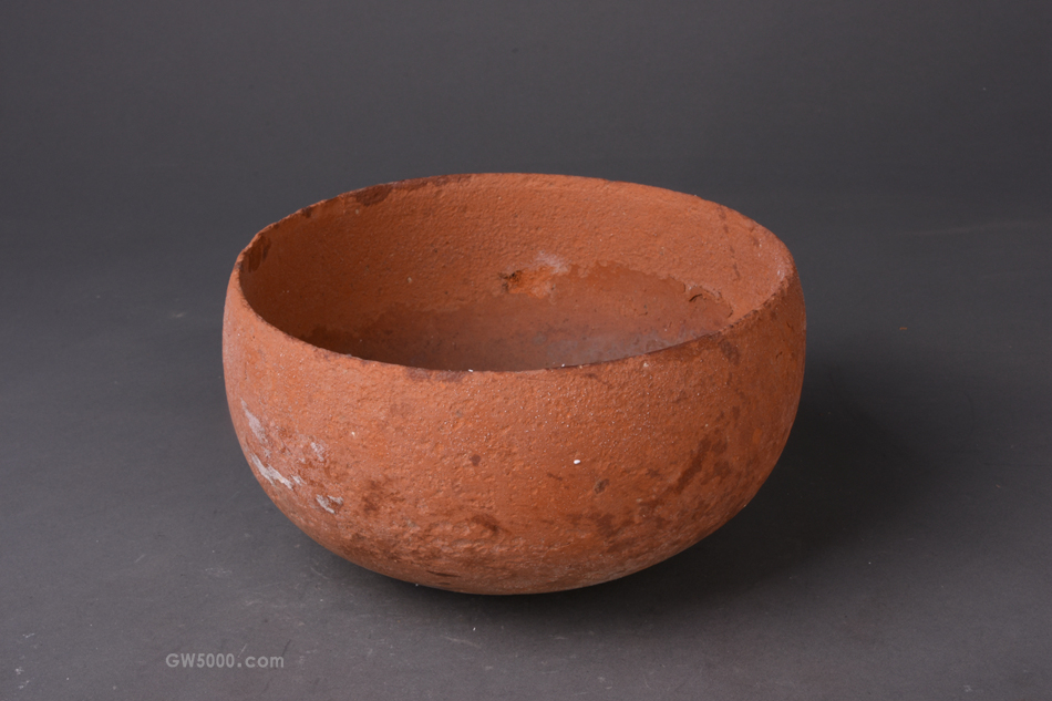 仰韶文化红陶圜底钵,口径22,高12,重1050,泥质红陶,敛口,弧腹内收,圜底。通体严重酥碱,陶质剥落。