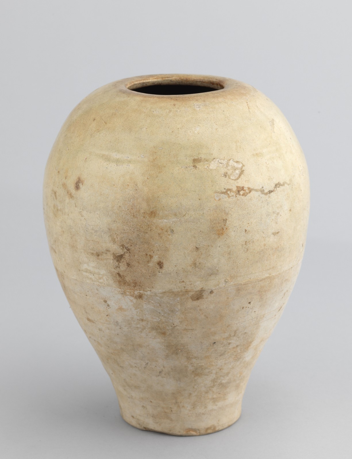敛口,溜肩,鼓腹下收,平底。腹上部施白釉,釉色发黄,腹下部至底无施釉,胎质较粗,露胎处可见明显接胎痕。