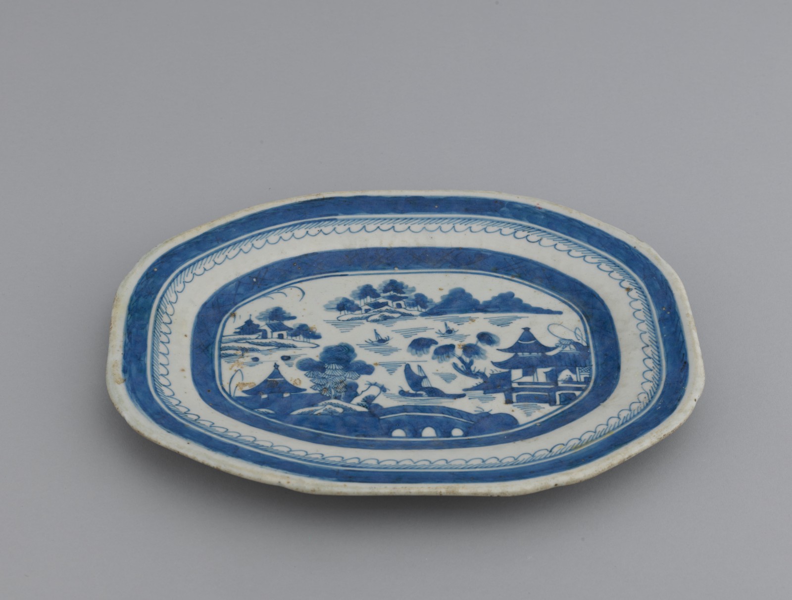 盘敞口、八方形,平底露胎。盘口沿内侧青花波浪纹饰一圈,盘心突出描绘青花梧桐图:远处湖上小岛及白墙青瓦的民居;近处枝繁叶茂的梧桐树,小桥流水,楼台亭阁,江面平波荡舟。整个画面通过点、线、面的巧妙结合,把江南水乡的优雅风光表现得淋漓尽致。色彩柔和,浓淡得宜。