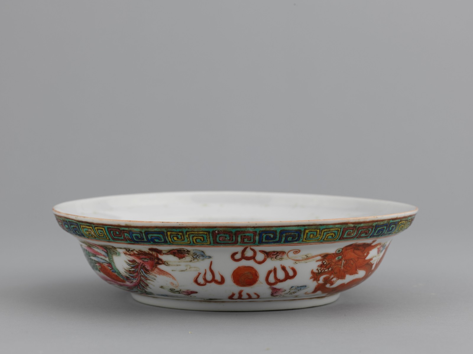 碗敞口,折沿,弧腹,圈足。碗心绘矾红团龙纹,正面龙头形象威武凶猛。外壁口沿处饰一圈回纹,外腹以五彩绘龙凤戏珠纹,龙身赤红,龙爪舒展,动感十足,神凤红绿相间,凤尾飘然,姿态优雅,龙凤间以火云纹为饰。底落“大清乾隆年制”矾红六字两行楷书款。