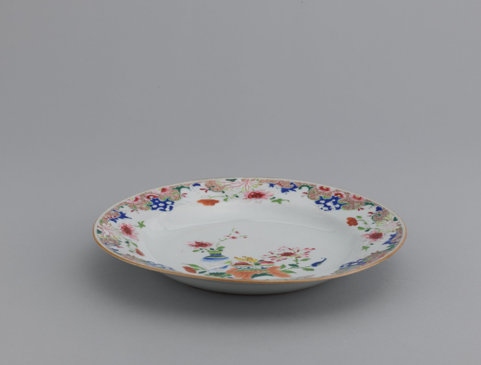盘敞口,宽沿、浅弧壁,圈足。盘中心以粉彩绘一幅《岁朝清供图》,主要有多福多寿的佛手、多子多孙的石榴、喜上眉梢的梅花、平安如意的花瓶等。通过画中物品的名称谐音、民俗寓意或历史掌故,来传达美好的新年祝福。内壁口沿以四组粉彩牡丹山石装饰。