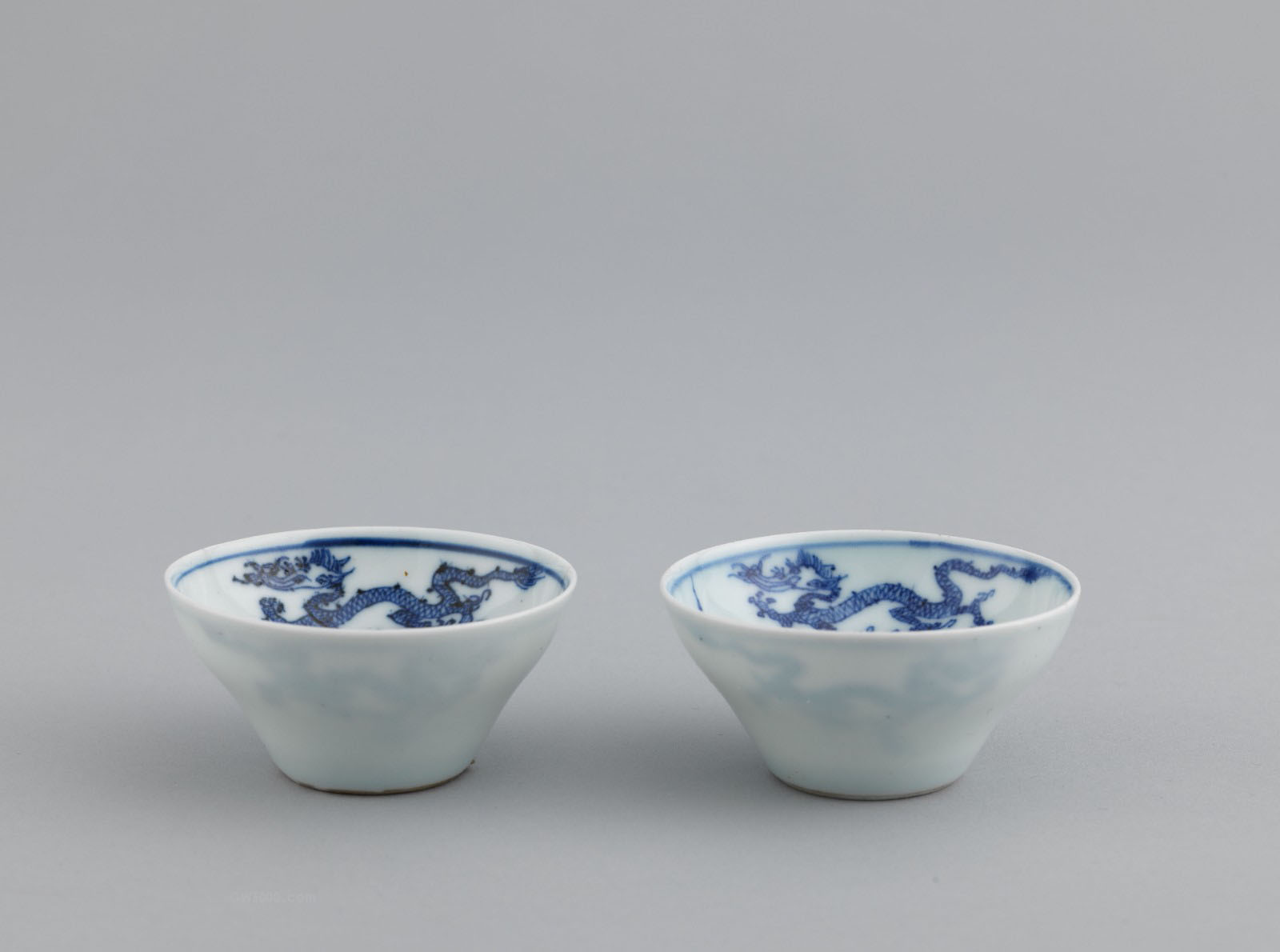敞口,腹部下弯,卧足,外壁施白釉,白中泛青。内壁青花绘双龙纹,龙纹仿成化风格,细小柔弱,内底青花绘火珠纹,底落“大清雍正年制”楷书款。