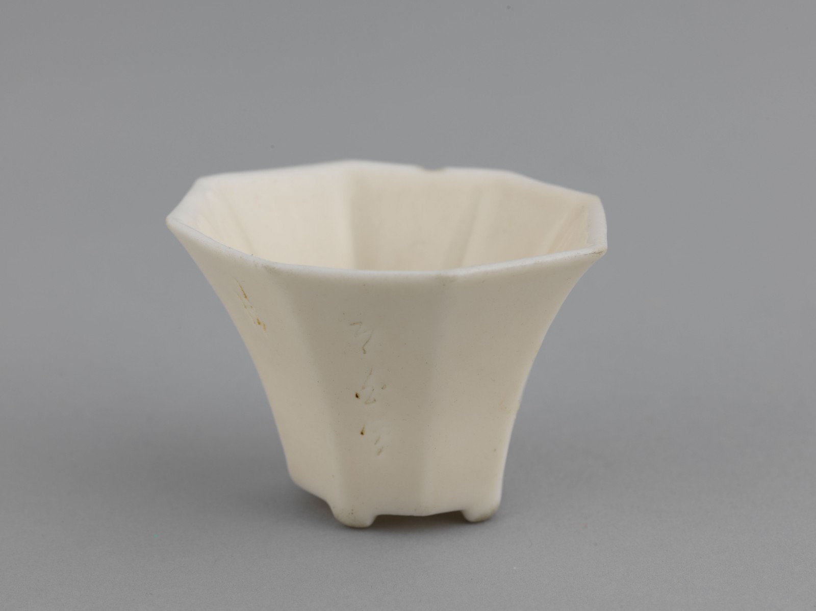 敞口,八棱状,底部四个乳足,腹部刻有草书,字迹潦草,辨认不清,底部有刻有方框。胎质细腻,釉水润泽,呈牙白色,古朴典雅,是明代德化白釉的佳品。