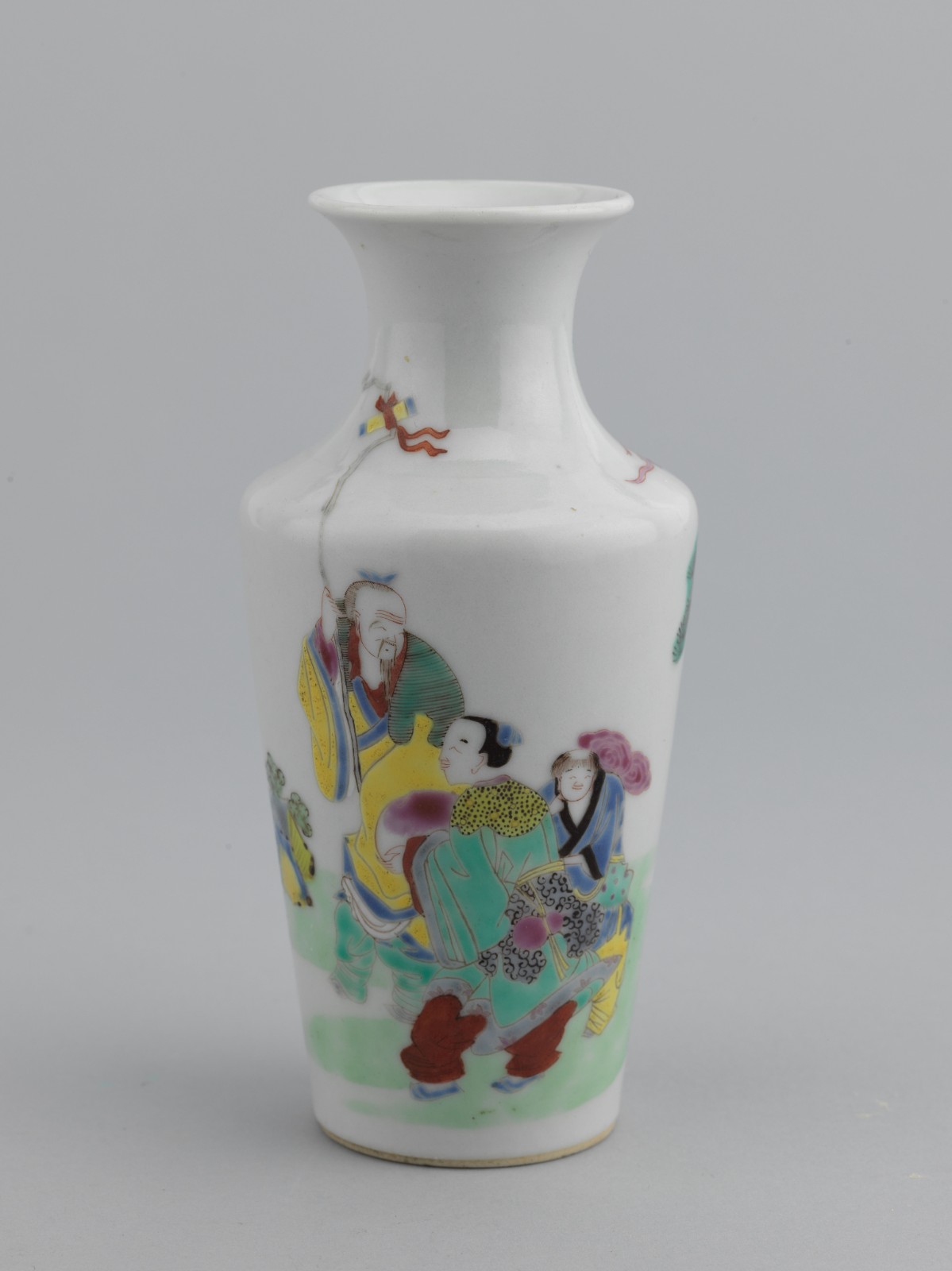 唇口,束颈,丰肩,斜直腹,圈足。胎体较薄,胎质细腻,以粉彩绘“贺寿图”、松石做背景,共三人,手持拐杖的老者为南极仙翁,一青年献仙桃,一中年献灵芝,寓意“福如东海、寿比南山”。粉彩色泽妍丽,层次丰富,艺术感较强。