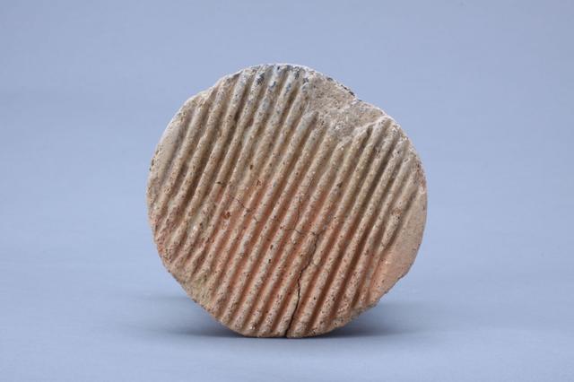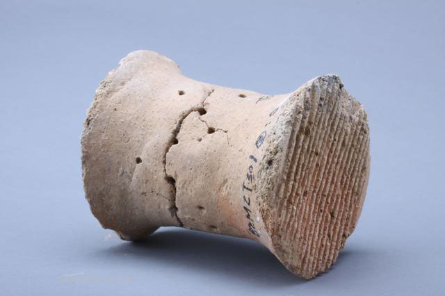 这是一件腰鼓形的陶拍,我们可以看到,它从中间断为两截,在裂痕的两端钻了一些小孔,可能是在摔断后,又用绳子接起来继续使用的痕迹。看来,昙石山先民们不仅聪明,而且还很节约。这么好用的宝贝,他们自然非常珍惜。