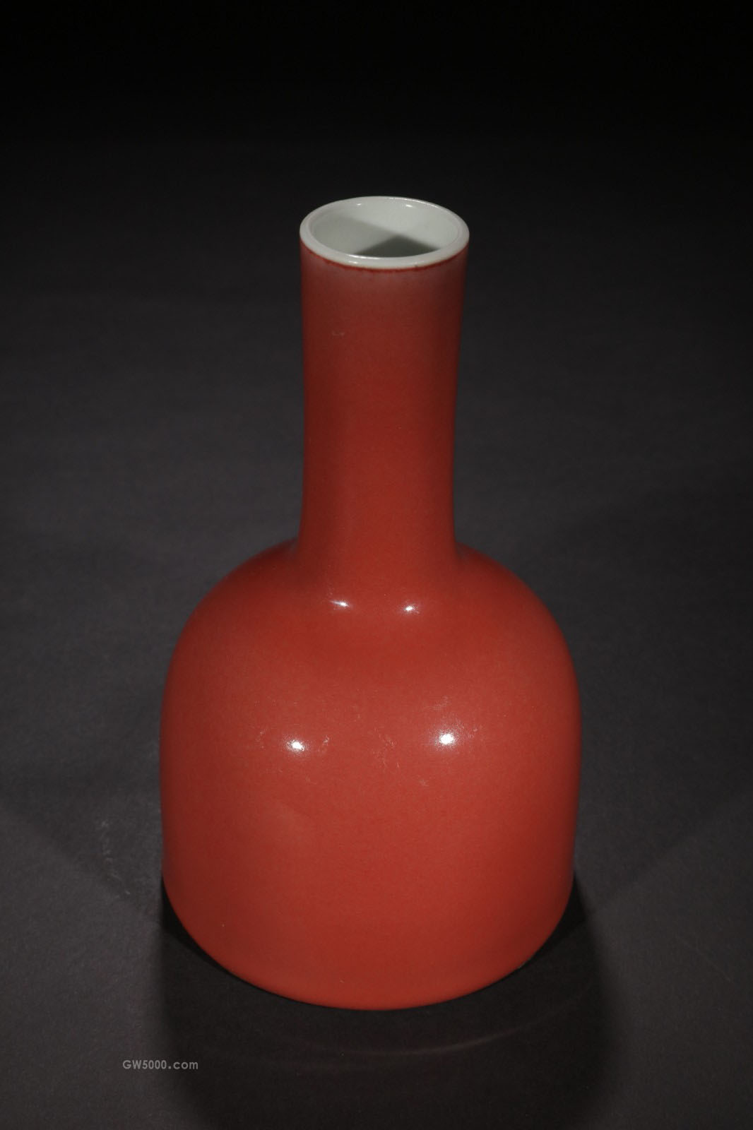 此尊长筒形颈,斜肩,直腹,平底。器型端正,胎质细腻,通体施祭红釉,釉色鲜艳如血。 祭红釉是景德镇的陶工在明宣德时期创烧的著名红釉品种,色似初凝的鸡血,深沉安定,莹润均匀,釉中无龟裂纹理,因祭红器作祭祀郊坛之用,故名。