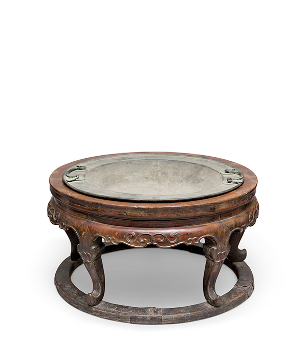 火盆架,通体黄花黎木制。面框五接攒成,有束腰,膨牙,拱肩展腿式外翻足,圆环式托泥,壸门式牙条,云纹足。造型及结构科学合理,时隔数百年,仍保持原生态容貌,殊为可贵。
