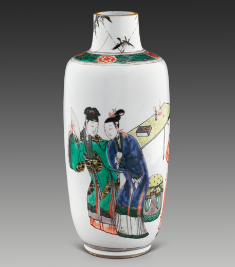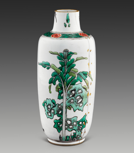 器形端庄修长,因其形似棒槌,故名“棒槌瓶”。瓶颈口部以黑彩绘墨竹二丛,笔触清晰,笔锋隐现。瓶肩部以红、绿彩饰锦地团花装饰纹带。瓶身一面墨线勾勒、绿彩填染洞石芭蕉;另一面则描绘出书案绣墩旁,一对少年夫妇相依而立、嗫嚅低语的画面。