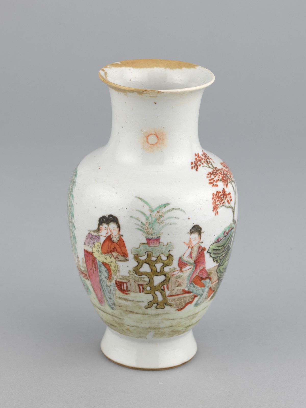花瓶造型规整,敞口,直颈,丰肩,腹部微收,圈足,足微外撇,口沿磕损,有修补痕,通体施釉,瓶外壁彩绘仕女图,花园庭院,正日阳光下,一盆盛开的兰花置于洞石花架,右一名罗衣长裙美女托腮斜坐榻上,身后假山上一枝梅花盛开,左立两名罗衣美女,其中一名侍女手托盘,盘中置一壶酒,美女身后青竹三枝随风摆动。底部矾红篆书“乾隆年制”方图章款,外框双方圈。此花瓶是画技拙劣,表现死板,没有层次,也没有立体感,是民国仿乾隆彩绘瓶。