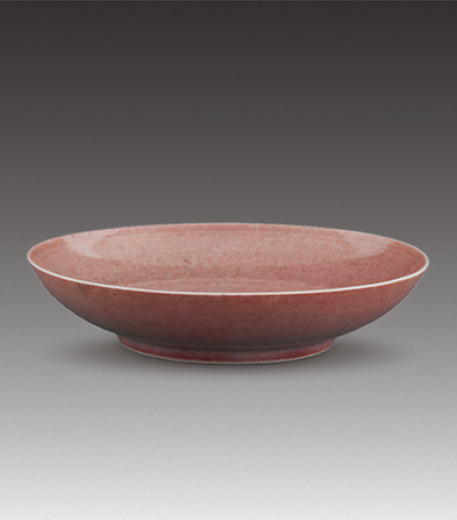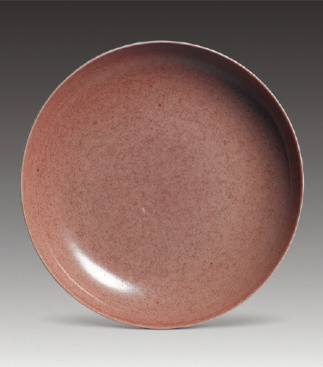 豇豆红是康熙朝单色釉的创新品种,十分名贵。因为烧成难度大,一般没有大件器。豇豆红以颜色似豇豆得名,目前学术界基本认同《南窑笔记》记载的一种名为“吹红”的瓷器即豇豆红。“吹红”的名称体现其制作工艺,以吹釉法施釉。豇豆红烧成难度大主要因为它是高温铜红釉,铜元素在高温下极易挥发,窑室内的温度与氧化还原时气氛的变化,以及铜元素在釉中的含量多少都会影响到最终的呈色。豇豆红表面釉常常呈色不均,出现深浅不一的斑点。雍正以后,豇豆红釉色灰暗,不及康熙朝。此件小盘即为雍正年间所造。