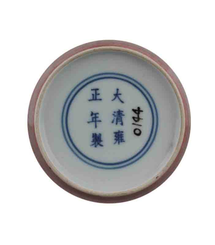 此器敞口,弧壁,圈足。内外壁均施釉,口沿及圈足内为白釉。外底青花双圈内署青花楷体“大清雍正年制”六字双行款。豇豆红釉色泽鲜亮,釉色深浅不一,有诗“绿如春水初生日,红似朝霞欲上时”形容其色泽给人视觉上的惊艳。