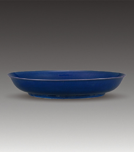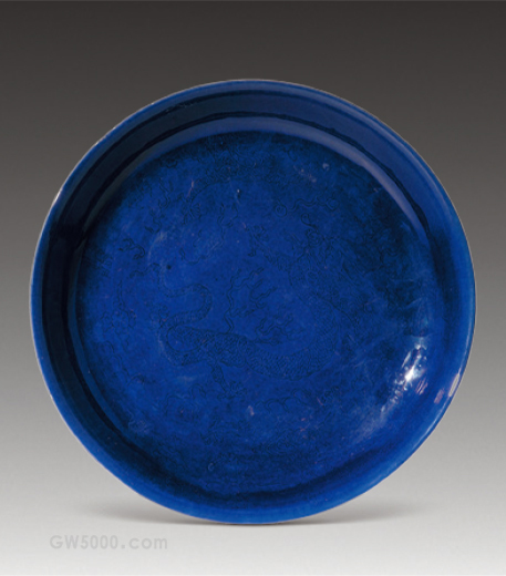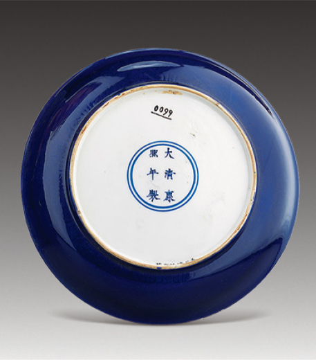 紫釉为低温颜色釉,因颜色似茄皮,故又称“茄皮紫釉”。由于配料和窑火气氛变化有别,紫釉呈色亦不同,有深、浅茄皮紫、葡萄紫、玫瑰紫等色。这件暗龙盘呈色为紫黑色,是深茄皮紫。此盘器型周正,胎质细腻,釉色虽深沉凝重,却暗藏光泽,盘内的图案若隐若现,艺术效果甚佳,代表了康熙时期官窑烧制茄皮紫釉的工艺水准。