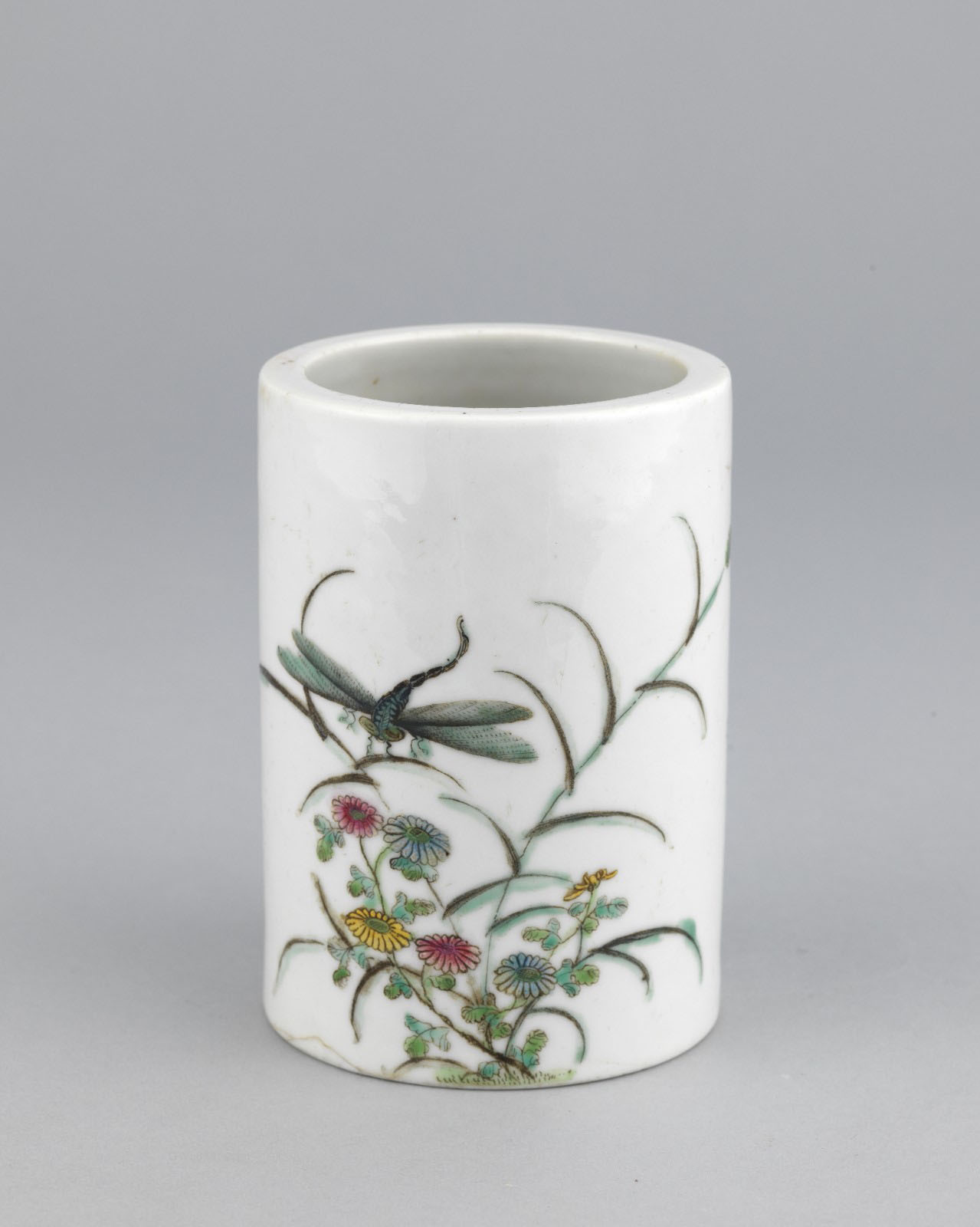 民国粉彩花卉蜻蜓笔筒