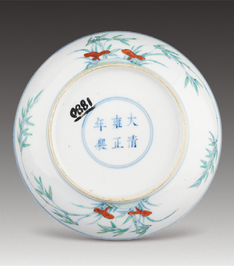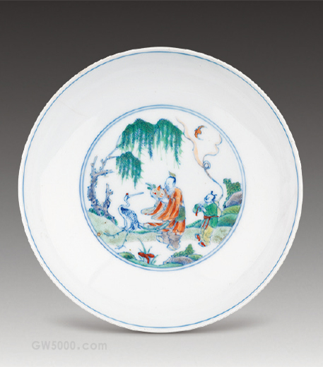 雍正斗彩为清代斗彩之最,该时期官窑斗彩胎质皆洁白细腻,釉色纯净滋润,制作工艺精湛,绘画生动活泼。雍正时期的斗彩在设色上力求以多种色彩表达物象。题材上,雍正帝喜好诗画又讲求祥瑞之兆,皇帝直接过问瓷器烧造,使得该时期的官窑作品清楚地彰显了帝王的喜好和品味。这件斗彩人物仙鹤盘充分代表了雍正斗彩的制作水平,堪称佳作。