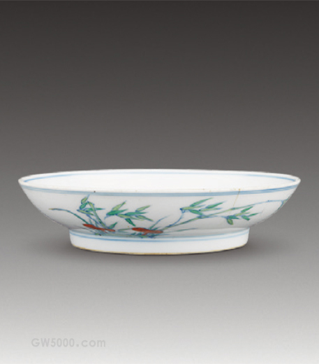 盘敞口,弧腹,圈足。造型规整,胎色洁白细腻;里外均施斗彩装饰,色彩鲜艳亮丽,清新明快。盘心青花双圈内绘有人物仙鹤图,构图饱满,画面中心为一长髯长者捧桃,身后跟随一双髻童子,身前为一回首仙鹤。画面四周空白处绘有垂柳、山石、芝草等吉祥图案,生动地反映出当时崇尚仙人与道教色彩的风气。盘外壁点缀有竹叶花草。圈足内施白釉,外底署青花楷体“大清雍正年制”六字三行款,外围青花双线圈。