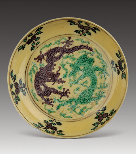 素三彩器烧制始于明正德年间,以康熙一朝烧制为盛,有许多名贵品种传世。素三彩器虽以黄、绿、紫三色为主,但并不限于此三色,惟不用红色。明代素三彩器制作方式是在高温烧成的素瓷胎上用彩釉填在已刻划好的纹样内,再经低温烧成。清代素三彩器技术革新,素三彩瓷逐渐使用黑彩勾勒代替以往的雕刻划线,使画面精致许多。此件素三彩黄地双龙纹盘两种方法并用,盘心采用刻划填彩的方式,使图案产生浅浮雕的视觉效果,盘外壁纹样则采用平涂的方式。
