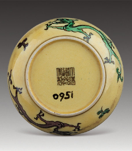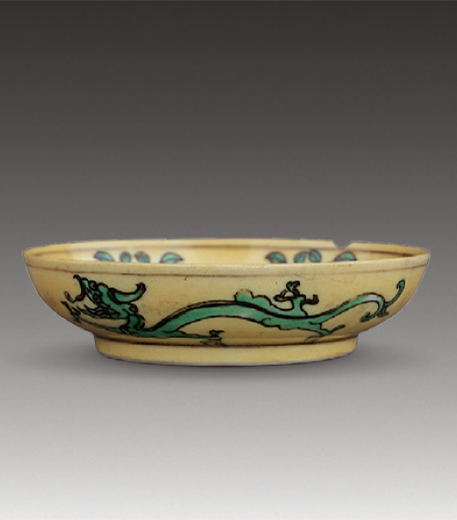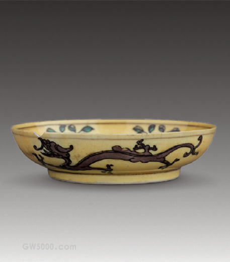 此盘造型及纹饰为清代御窑的标准样式,道光时期素三彩瓷器虽然仍在继续烧制,但是品种及造型已远不如康熙时丰富,目前传世品中以此种黄地绿彩龙纹、凤纹盘、碟等器物居多。