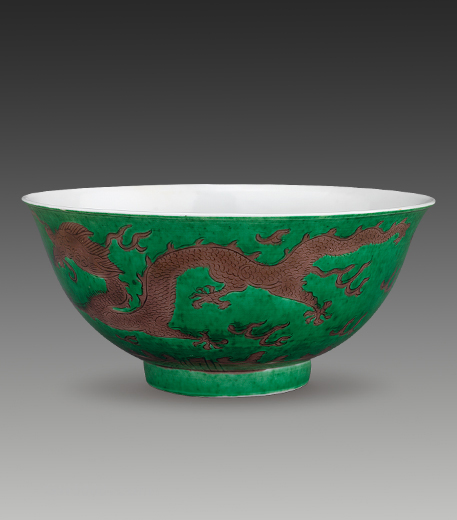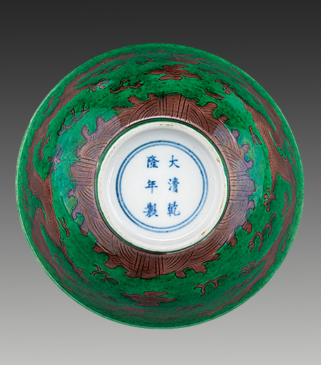 碗撇口,深弧腹,圈足。里施白釉。外壁以绿釉为地,饰紫色行龙纹两组及朵云、火珠纹。足内施白釉并署青花楷体“大清乾隆年制”六字三行款。此碗为景德镇官窑烧制的御用餐具。在清代宫廷生活中,不同等级的皇室成员所使用的瓷器餐具品种在釉色、纹饰和数量上都有着严格的区分。此碗应为后宫中“贵人”所用的餐具。