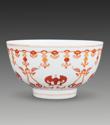 碗敞口,深弧腹,圈足。底署青花篆体“大清乾隆年制”六字款。里白釉,外壁釉以矾红彩装饰。口沿下有矾红彩线两道,外壁上部绘一周璎珞纹,下部绘五蝠捧寿纹,足外墙红彩线条两道。蝙蝠是清代动物题材中最为常见的,人们用它的谐音寓福于其中,表现对幸福生活的向往与追求。