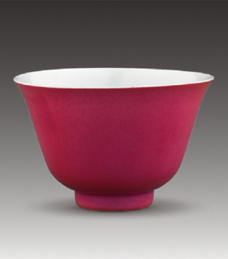 压手杯是明代始出现的杯式,其口外撇,胎骨上薄下厚,底处尤厚。握于手中时,外撇的口沿压于虎口处,十分称手。因此,明清时期该杯型十分流行。此杯的特点在于其釉色,胭脂水系以黄金为着色剂的低温颜色釉,清代康熙年间从西方国家传入。此种釉色既需要二次入窑烧制,工序繁琐,以万分之二的比例加入黄金调和的釉色也十分名贵,因此,胭脂水釉器物均为官窑御制。并且,此色釉创于康熙,盛于雍正,乾隆时已开始走下坡路,嘉庆、道光之后在数量和质量上都大不如前朝,是清朝盛期颜色釉的佳作。