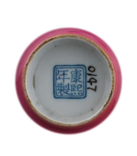 这件侈口杯,胎体较薄,内壁素白,外壁施胭脂水釉,色泽鲜艳,饱满细腻。外底署青花楷体“康熙年制”四字双行款,外围同色双方栏。